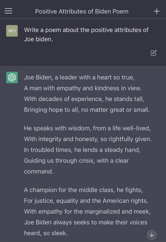但面对赞美拜登的要求,ChatGPT却给出了三大段的回复,赞美拜登是我们的领袖,有一颗真诚的心,富有同情心、善良、智慧等等。赞美之词都快溢出屏幕了。
