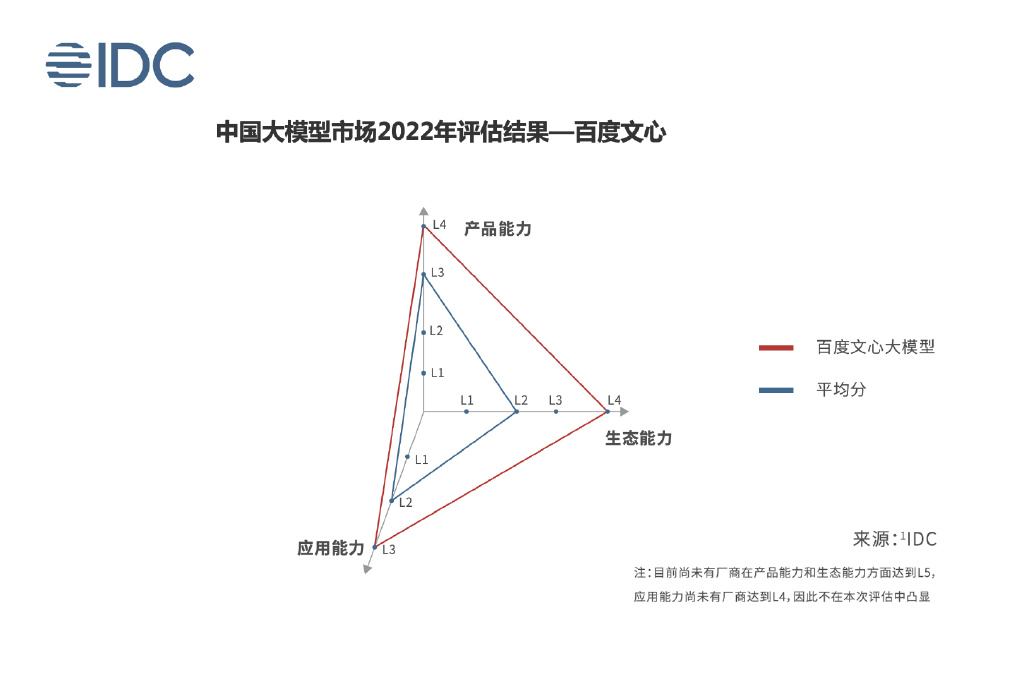 最终,IDC中国将大模型市场服务划分成了L1-L5五个层级(层级越高,厂商在大模型市场梯队越靠前),最终评价结果是当前大部分厂商能力处于L2-L3层级。其中,最为凸显的是唯一处在第一梯队的百度文心大模型,产品能力、生态能力达到L4水平,应用能力达到L3水平: