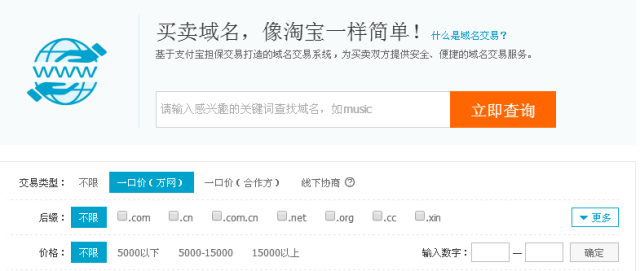 注:2016年1月16日,平台当前仅支持一口价域名交易,后续将逐步支持议价、拍卖及其他交易方式,产品持续快速迭代。