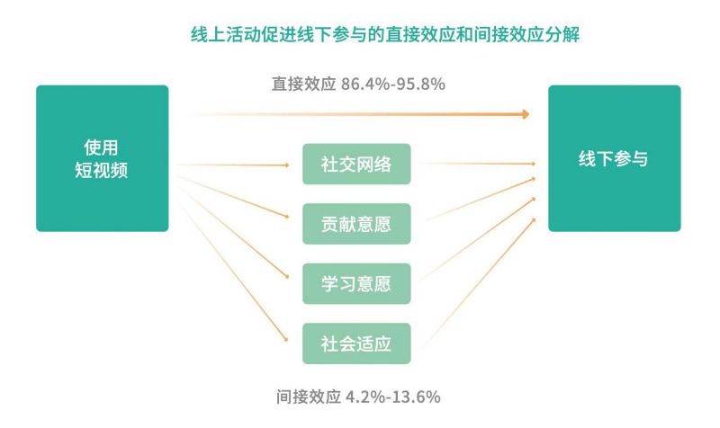 《报告》还总结了短视频使用促进老年人线下参与的实现路径:通过直接效应和间接效应共同作用。其中直接效应占比86.4%-95.8%,间接效应占比4.2%-13.6%。