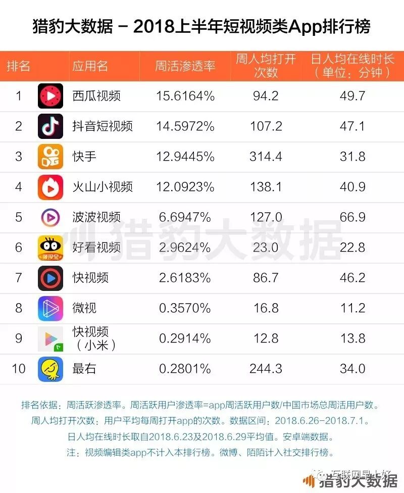 2018上半年短视频App榜单:西瓜视频排首位,抖音排名第二