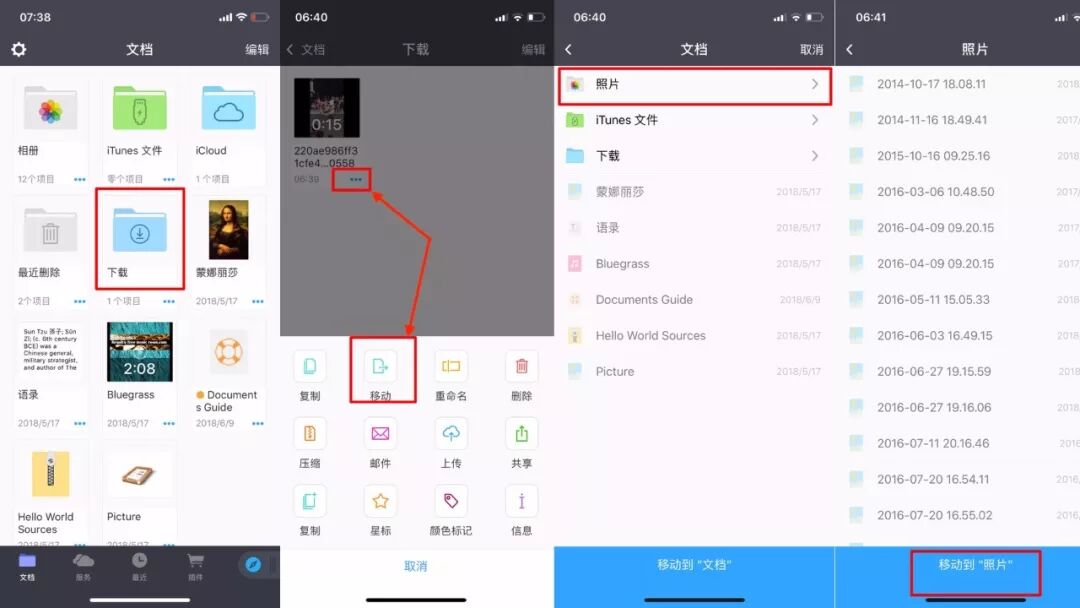 返回Documents文档主界面,找到下载,点击视频右下角···,选择移动,把视频移动到文档中的照片里面就可以了。
