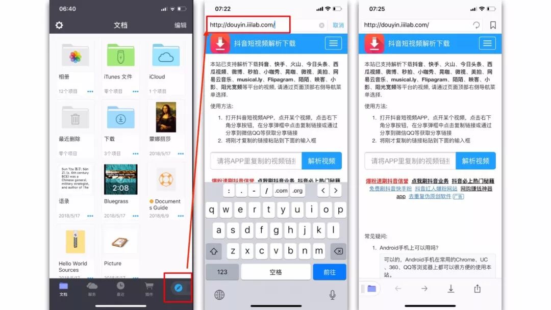 打开Documents,点击右下角内置的浏览器,将网址:http://douyin.iiilab.com/,复制进去。