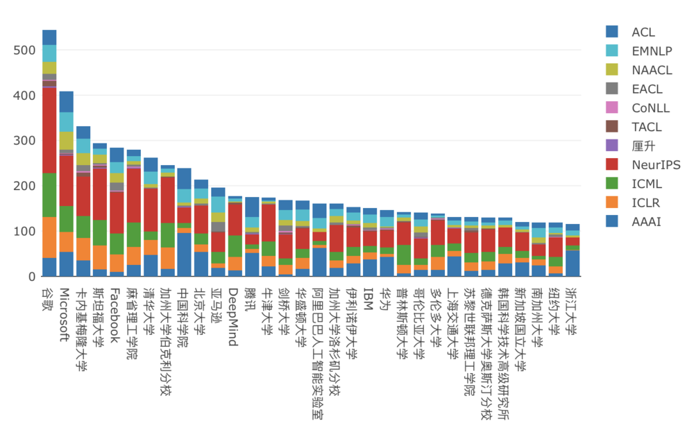 据机器学习和自然语言处理著名学者Marek Rei教授在2022年4月发布的统计(2023年的统计尚未发布)显示,2012-2021年中,在ML(Machine Learning,机器学习)和NLP顶级期刊和会议发表论文数量最多的机构是谷歌,微软紧随其后。发文数量最多的中国机构是清华大学,第二是位列第16的腾讯,腾讯也是前32名中唯一的中国互联网厂商。不过,在2021年单年的统计中,阿里和华为也登上此榜,腾讯仍排在较靠前的位置。