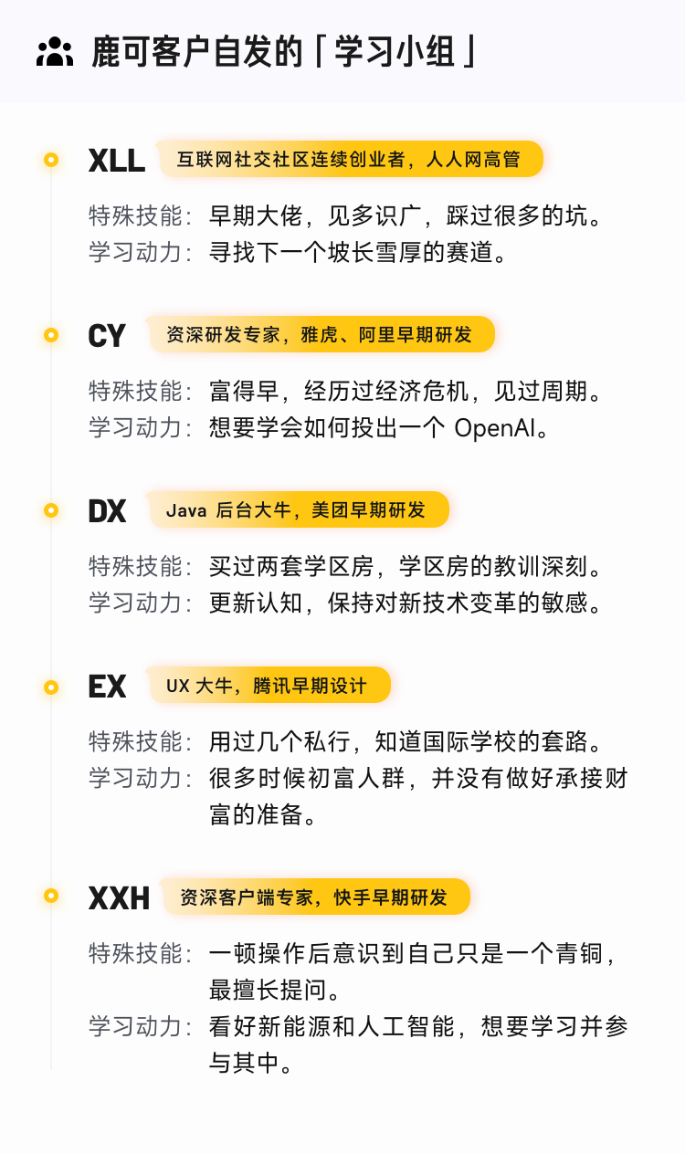 此外我还加入了由鹿可客户自发组建的学习小组,他们的目的是让有共同行业背景履历的人互相探讨、分享认知和资源,从而降低学习成本。