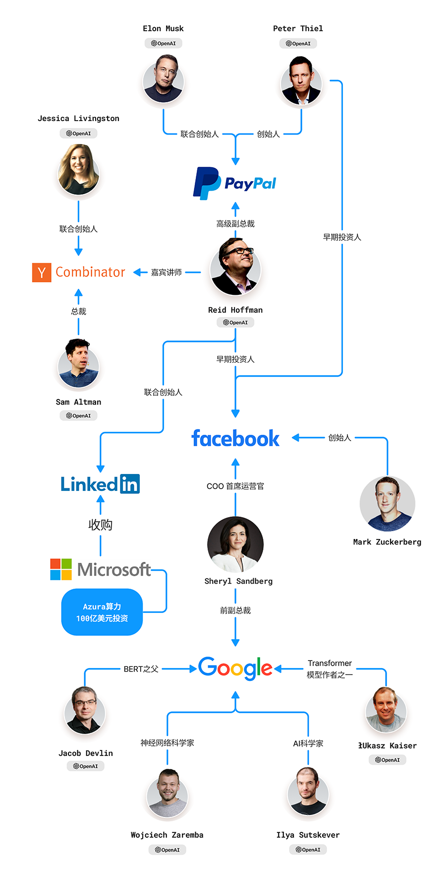 这类资源网络有些是以某个人为连接点。比如在OpenAI的核心人才网络中,我们可以看到一个核心连接人,是OpenAI的早期投资人:雷德·霍夫曼。在硅谷有一句话:在硅谷如果你想创业,霍夫曼是第一个你应该找的人。