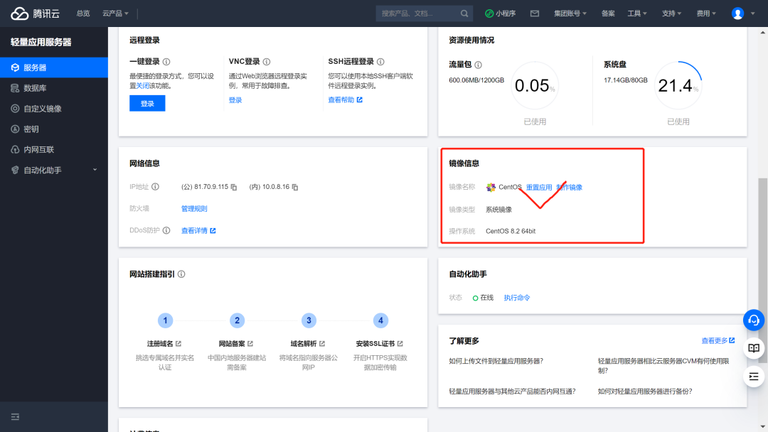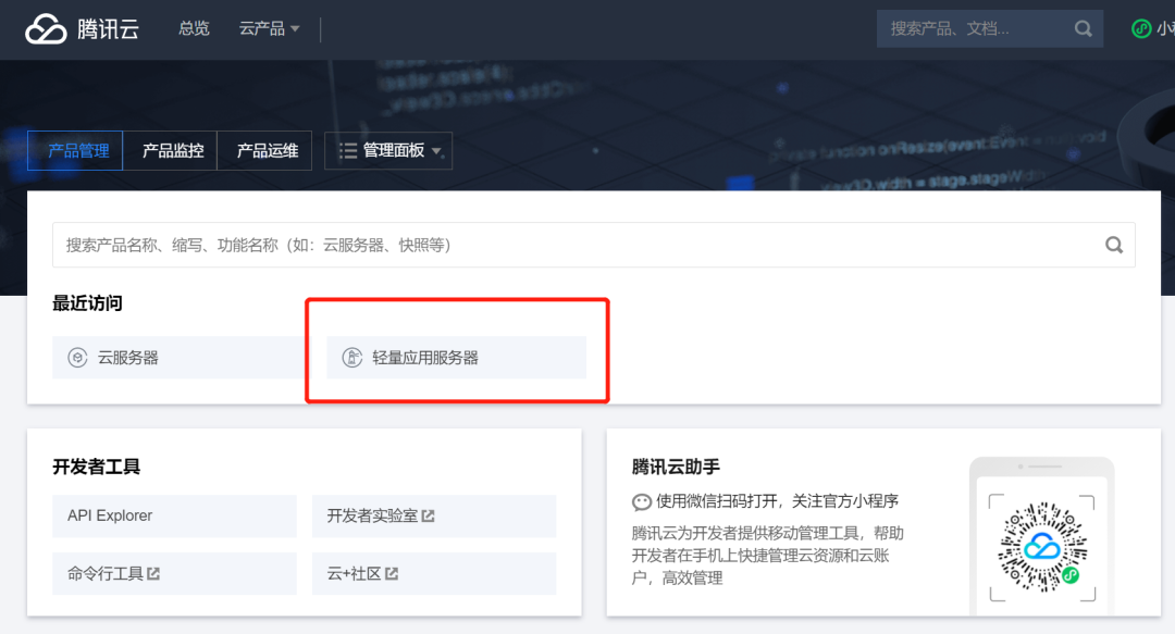 话说腾讯云这个设置非常恶心,订单交易成功,但是始终找不到IP地址,我找了一天都没找到如何登录,打客服电话打不通,提交工单提交不了,就是一个智障的客户机器人。真想把产品经理叫过来削一顿,看在价格便宜就放过他了。后来终于发现在这里。一定要点击轻量应用服务器,我之前一直都在云服务器选项里找。