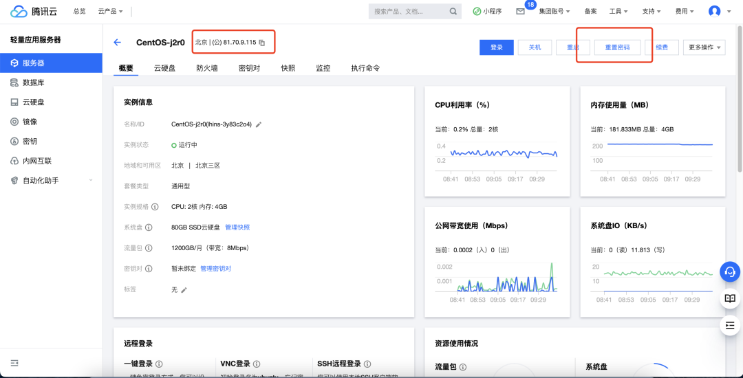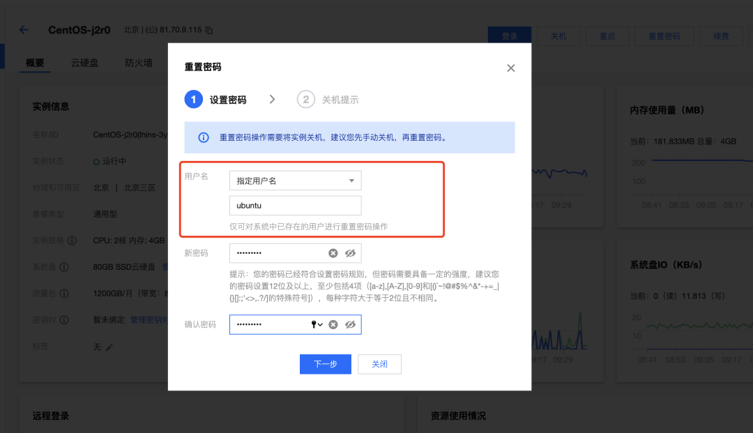 腾讯云默认使用密钥登录,这对新用户比登天还难,还是使用账号密码方便,点击重置密码。然后指定用户名,注意Ubuntu系统默认不让用root登录,centos可以直接指定root账号。然后设置密码。