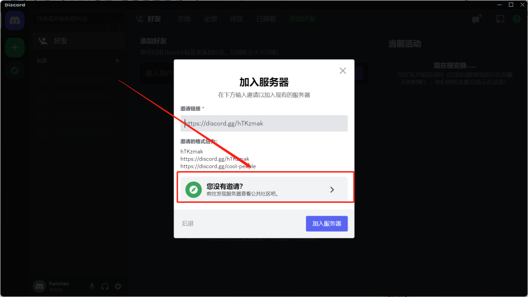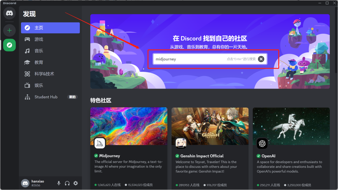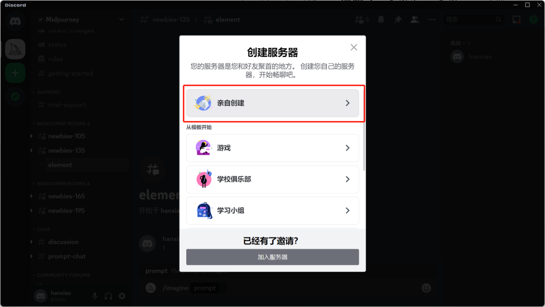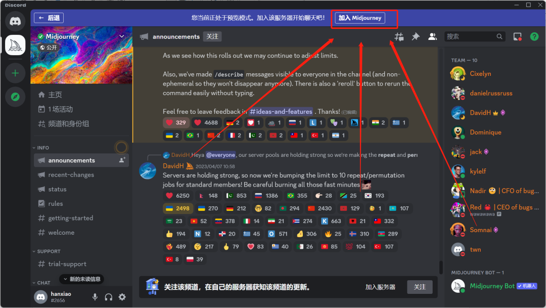 进入后会有个提示,我们直接×掉即可,点击上方的加入Mjdjourney
