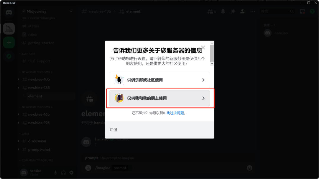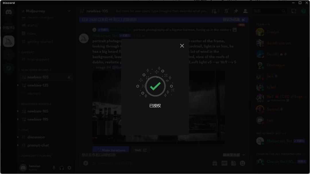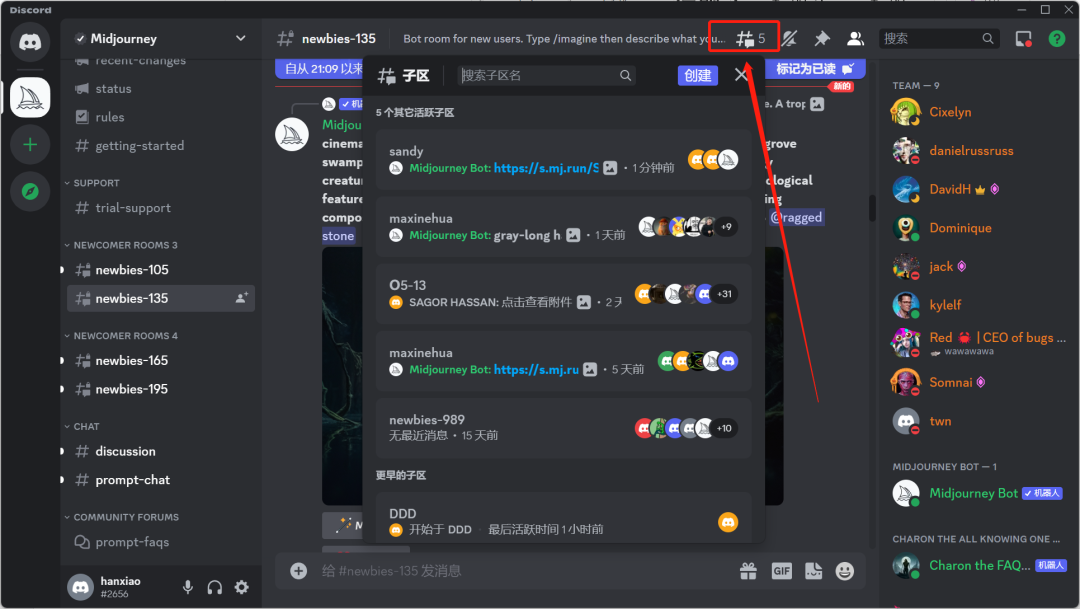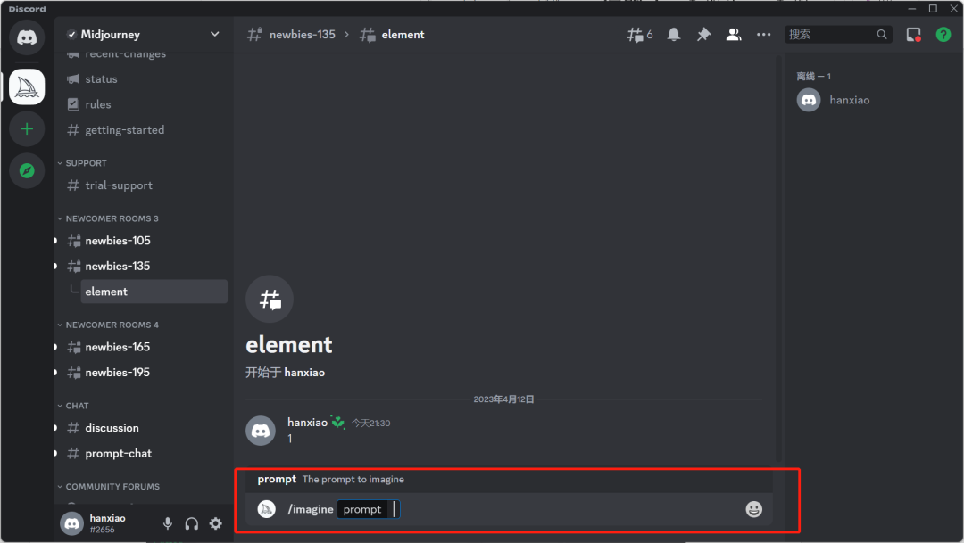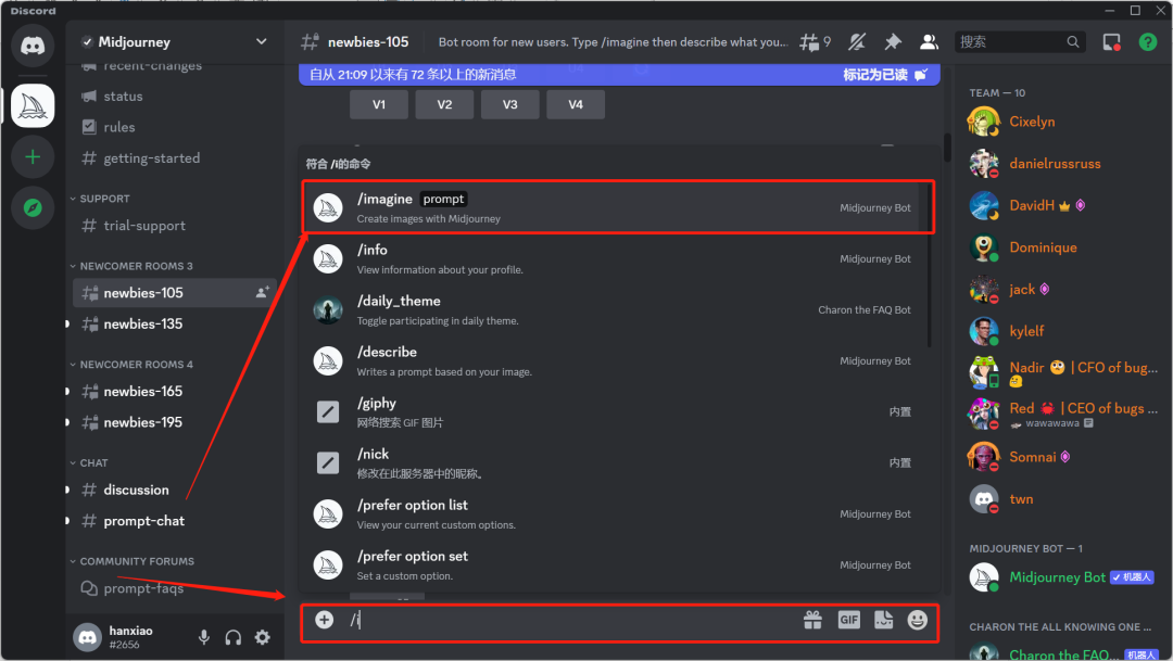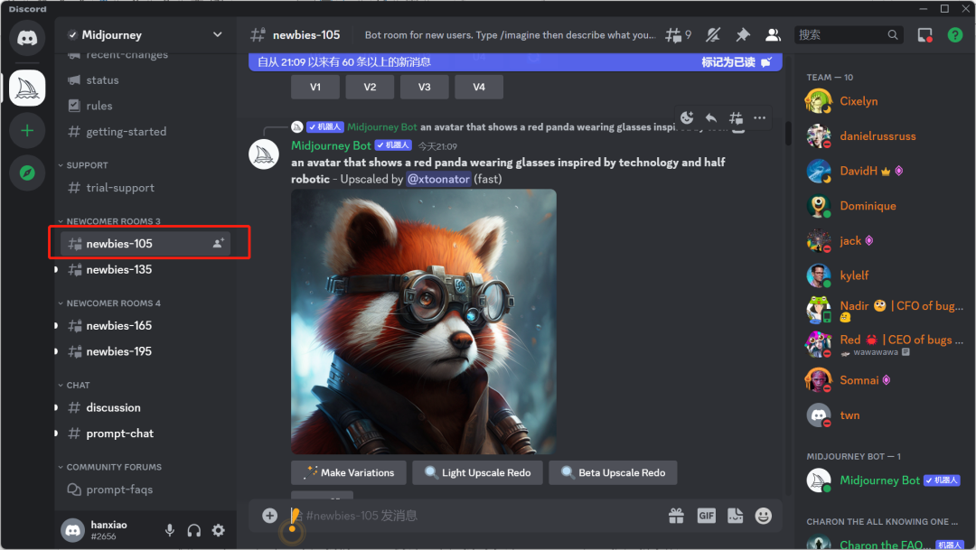 比如我目前选择的是newbies105号房间,我们可以在对话框中输入/ imagine