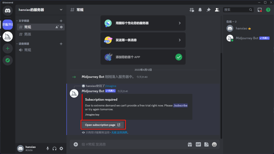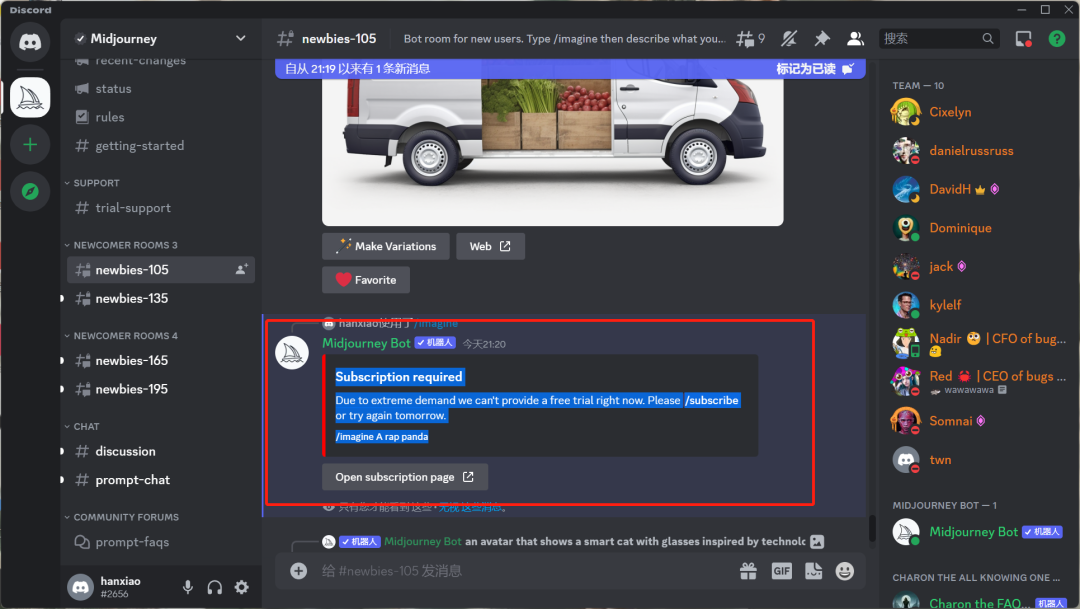 更多人可能会面对下面这种情况,显示让我们订阅或者明天再来,这是因为目前Mjdjourney非常火爆,所以它目前不再提供免费服务了。