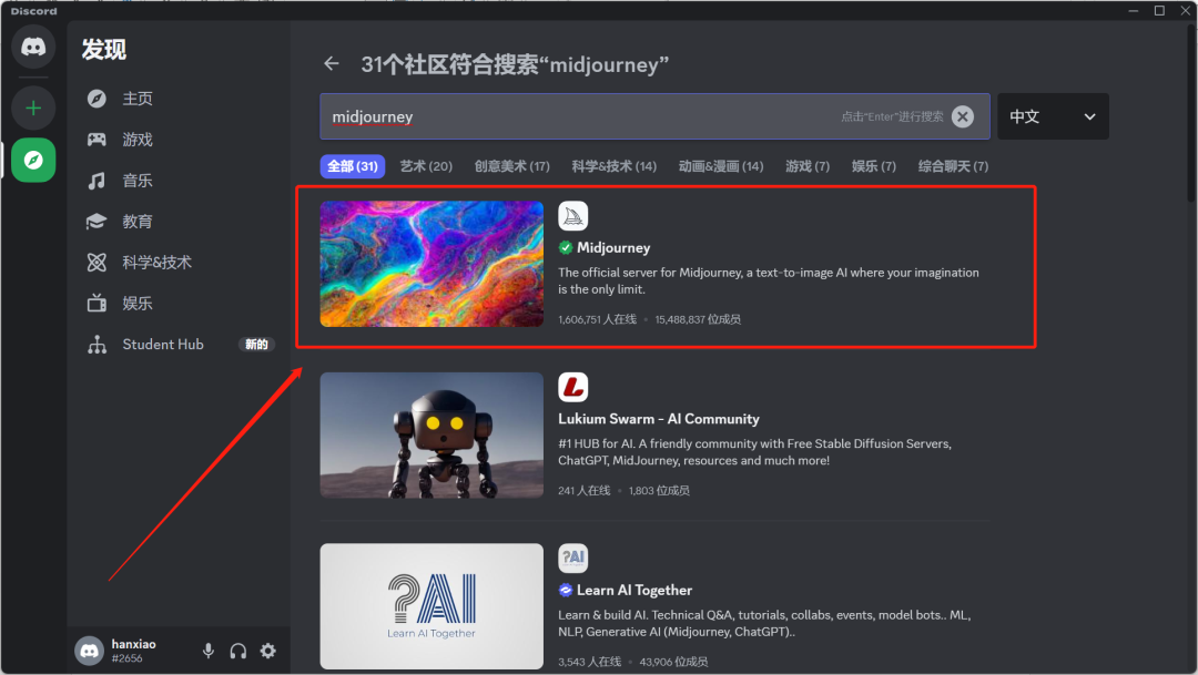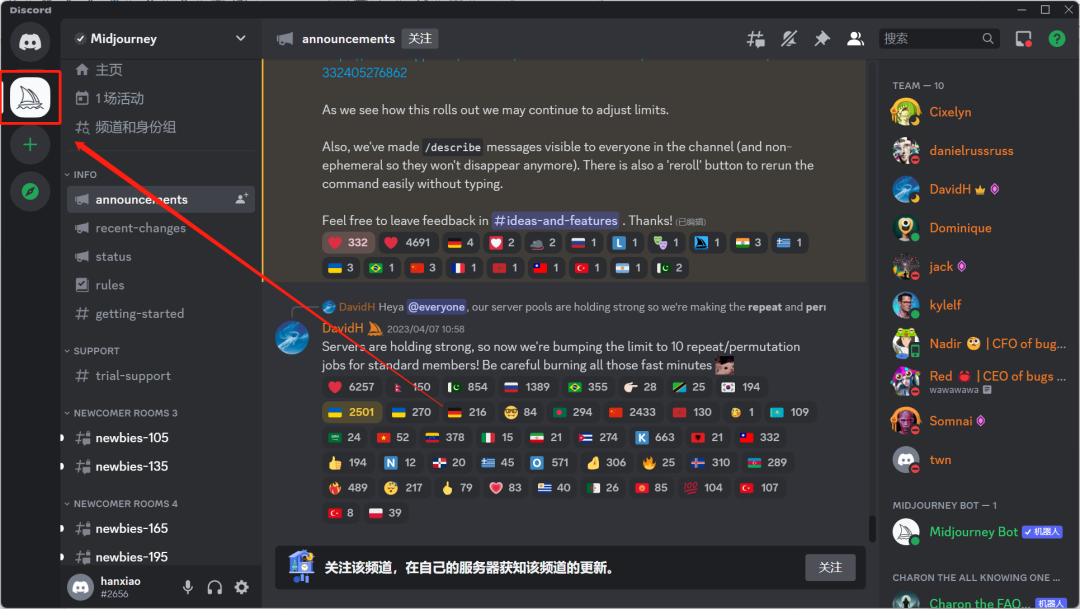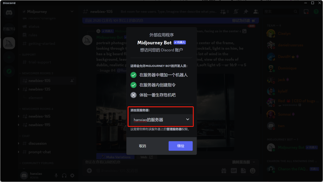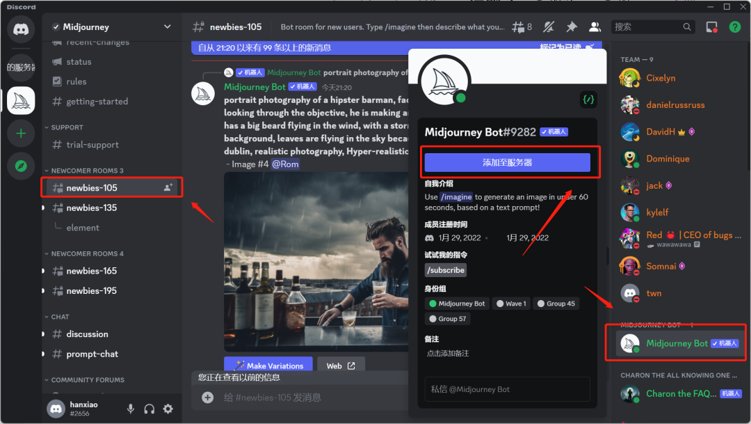 接着我们去Midjourney里把机器人拉过来,随便那个频道都能找到的,都在右侧的下面