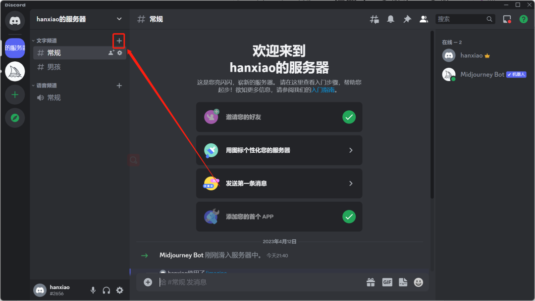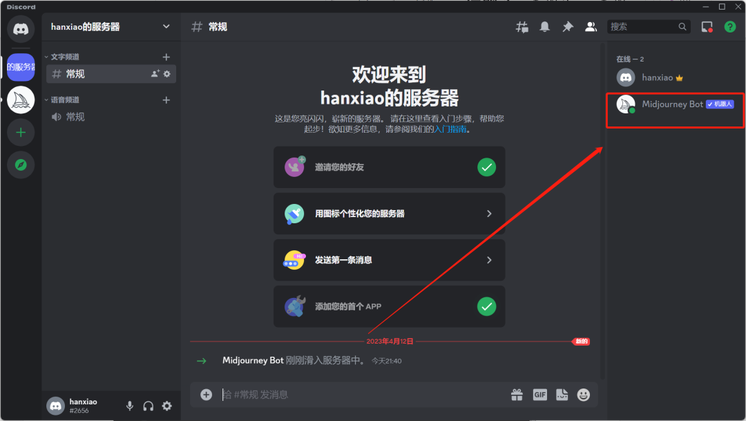 回到我们刚刚创建的频道,看看机器人有没有被拉进来