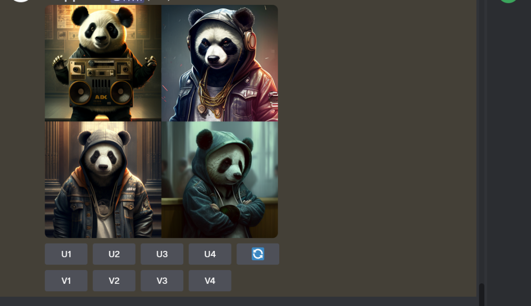 U和V后面的数字都对应着各自的图片,图片按照从左到右的顺序排列,U是选择对应的图片,并增加细节。V是以此风格再生成四张图片。