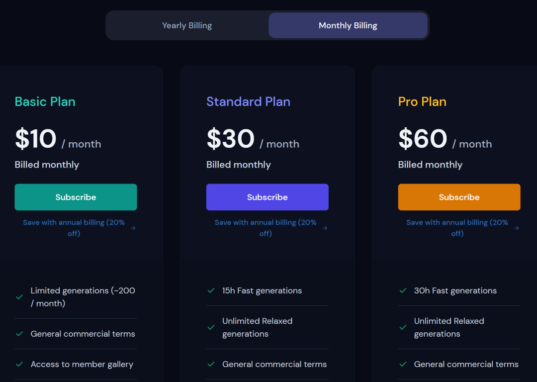 30美元会员:每月生成的图片无限制,每月15小时的fast使用时长。