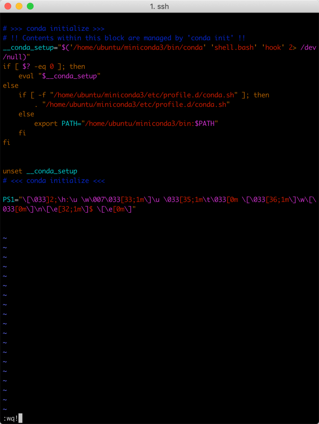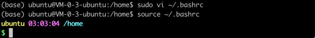 sudo vi ~/.bashrc在最后插入配置行PS1="\[\033]2;\h:\u \w\007\033[33;1m\]\u \033[35;1m\t\033[0m \[\033[36;1m\]\w\[\033[0m\]\n\[\e[32;1m\]$ \[\e[0m\]"保存后退出source ~/.bashrc♚