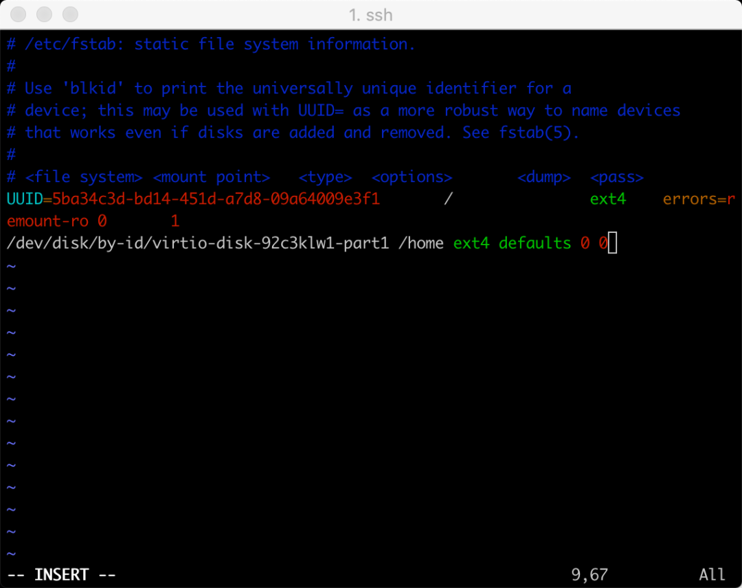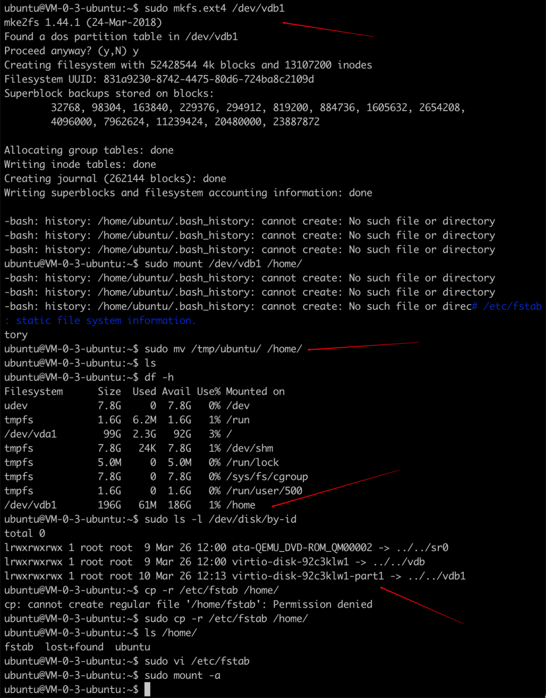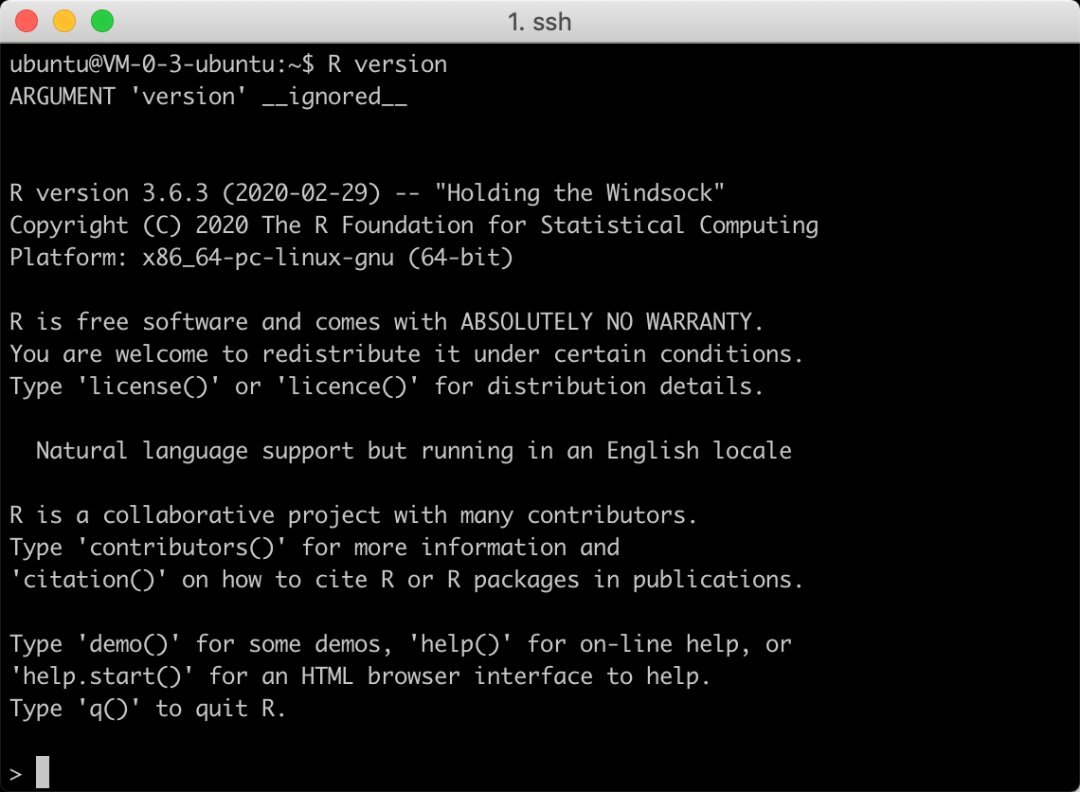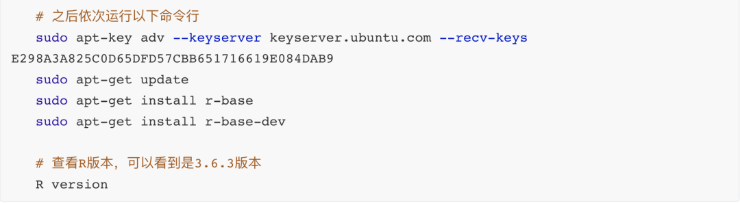 df -h 服务器原始的状态sudo fdisk -lsudo mkfs.ext4 /dev/vdb1ls /home/sudo mv /home/* /tmp/sudo mount /dev/vdb1 /home/sudo mv /tmp/ubuntu/ /home/设置自动挂载数据盘,这样关机或者重启后,就不需要再次挂载sudo ls -l /dev/disk/by-id查看数据盘的idsudo cp -r /etc/fstab /home/ls /home/sudo vi /etc/fstab在最后以后写入如下/dev/disk/by-id/virtio-disk-92c3klw1-part1 /home ext4 defaults 0 0退出sudo mount -a如果以上顺利运行,就说明挂载成功了df -h02.安装R语言