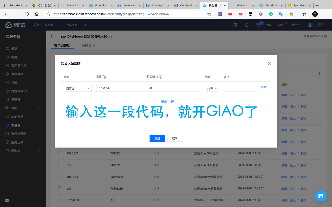 这里要特别感谢生信技能树群里的小伙伴,jimmy、skk、李东野、黯蓝、卖萌哥、小洁,在他们的热心帮助下,解决了这个问题!万分感谢!问题出在腾讯云的安全组设置!