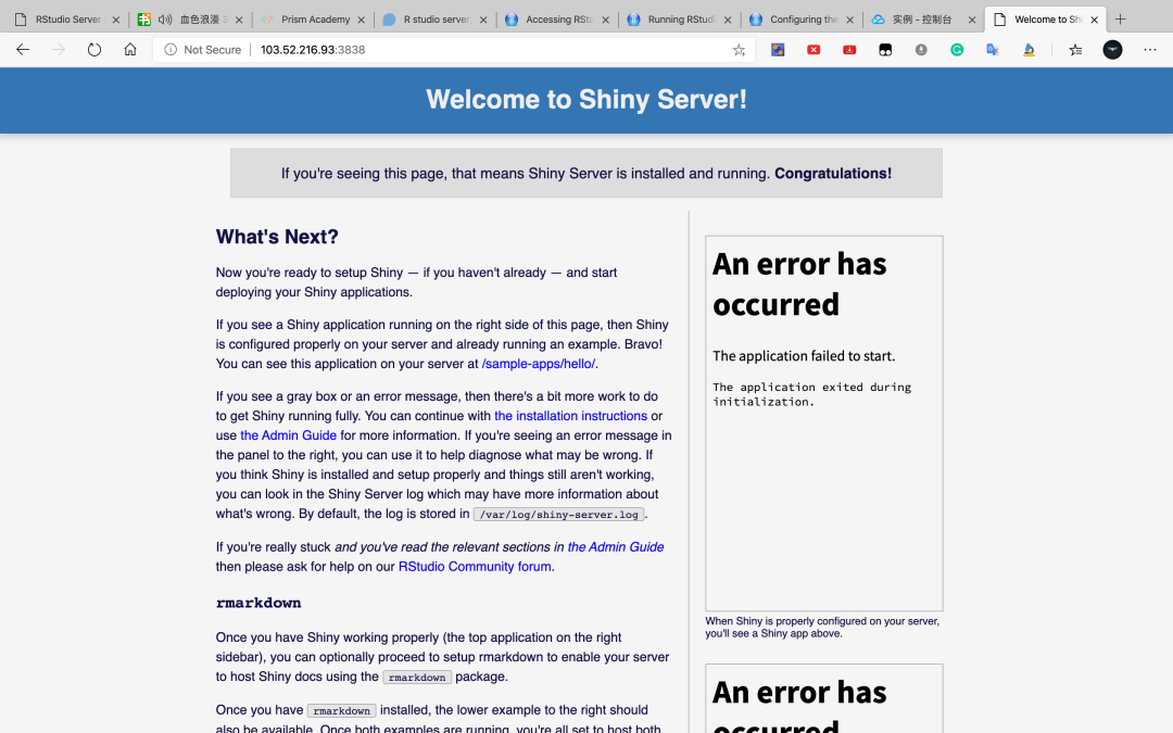 这里碰到一个问题,安装完rstudio-server及shiny后,无法登录8787端口及3838端口,完全不能快乐啊!