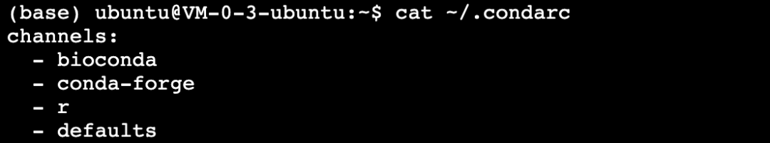 conda config --add channels r 一行一行运行,运行后无提示,即运行成功conda config --add channels conda-forgeconda config --add channels biocondacat ~/.condarc 如果安装成功conda create -n rna python=3 创建一个名为rna的小环境成功后,截图如下进入环境,安装软件