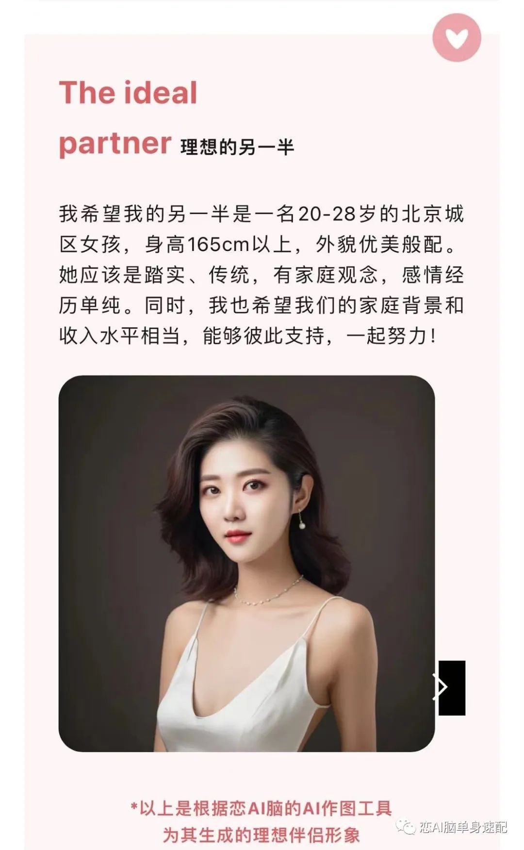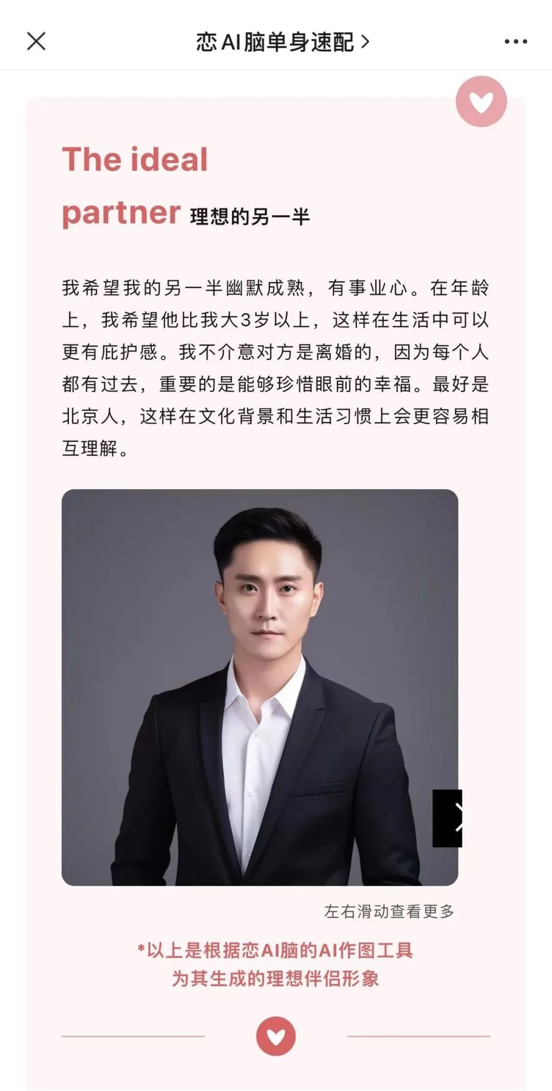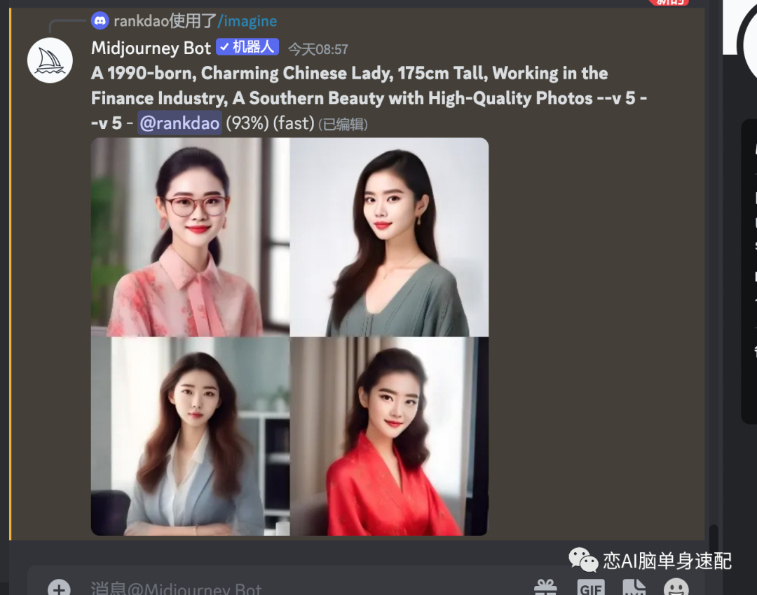 随着GPT和midjourney的爆火,许多行业开始用到这个技术了。近日,一款做单身社交的公众号引起了众多单身人士的关注。据悉,这款公众号采用了ChatGPT和midjourney可以根据用户需求用A