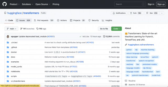截至目前,Hugging Face 上共有近13.5万个预训练模型,在 GitHub 上拥有超过 1660名贡献者,54000名用户,81000颗stars和18000次forks,平均每天有超过5万人从 Hugging Face下载模型。
