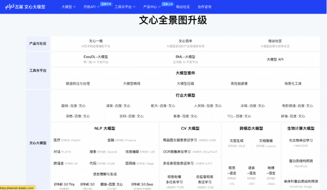 去年末,文心大模型迎来全面升级。在模型层一次性发布11个大模型,涵盖基础大模型、任务大模型、行业大模型的三级体系;工具与平台层,升级大模型开发套件、文心API和提供全流程开箱即用大模型能力的EasyDL和BML开发平台;新增产品与社区层,包括AI艺术与辅助创作平台文心一格、产业级搜索系统文心百中和旸谷社区面向个人用户。