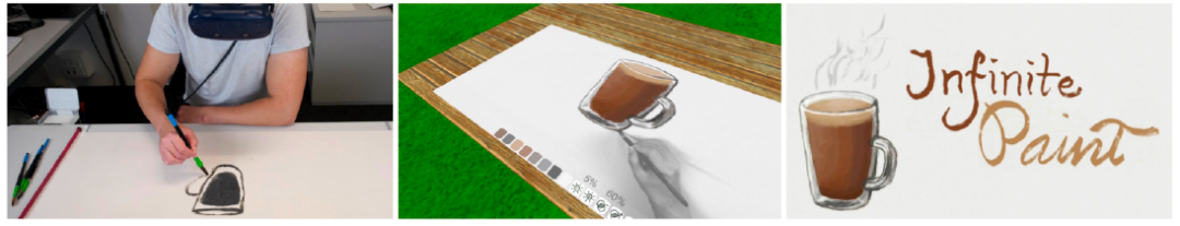 那大家是否想过可以通过某种方式在数字系统中来模拟这种传统绘画的感受呢?Andreas Rene Fender等人收录在CHI(Computer Human Interaction Conference)中的研究成果提出了InffinitePaint系统,一个在真实纸上用真实的湿画笔支持虚拟现实中的数字绘画的系统。使用特殊的纸张,当它与水接触时变成黑色,干燥后再变成空白。相机通过捕捉一些临时画笔,经过AI将其数字化,从而在VR空间内模拟实际绘画的感受,并对此做了测试。测试者无需颜料,只需一个临时画笔,即可在无限的纸张中进行类似于真实的绘画。