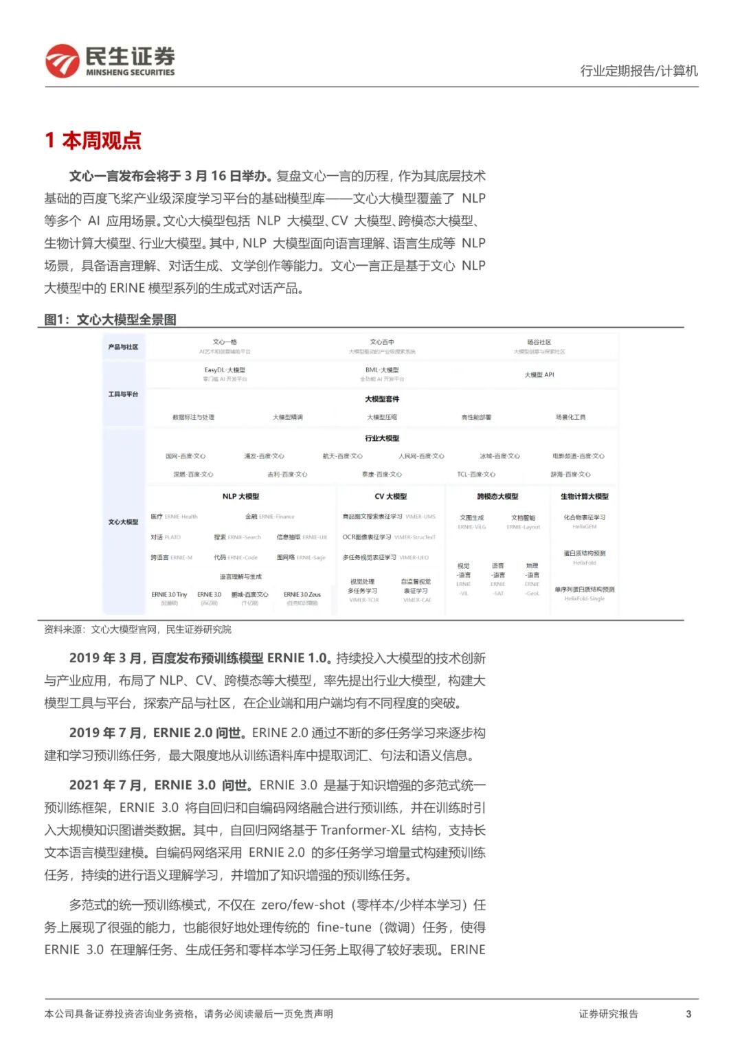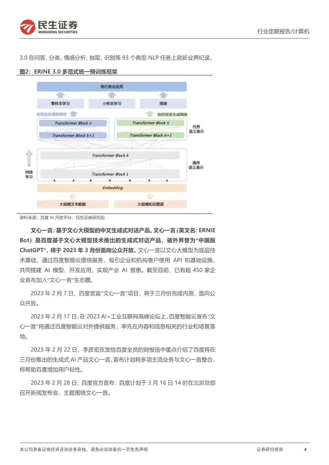 复盘文心一言的历程,作为其底层技术基础的百度飞桨产业级深度学习平台的基础模型库——文心大模型覆盖了 NLP等多个 AI 应用场景。文心大模型包括 NLP 大模型、CV 大模型、跨模态大模型、生物计算大模型、行业大模型。其中,NLP 大模型面向语言理解、语言生成等 NLP场景,具备语言理解、对话生成、文学创作等能力。文心一言正是基于文心 NLP大模型中的 ERINE 模型系列的生成式对话产品。