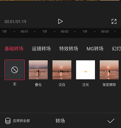当我们剪完视频或者合并视频的时候,如果两段视频不能很好的过渡,那么这个时候我们就可以运用转场功能来让他们完美的衔接在一起。