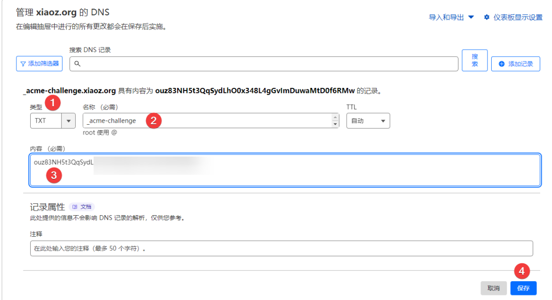 xiaoz使用的CloudFlare,直接去CloudFlare后台根据来此加密的要求添加TXT类型的解析。