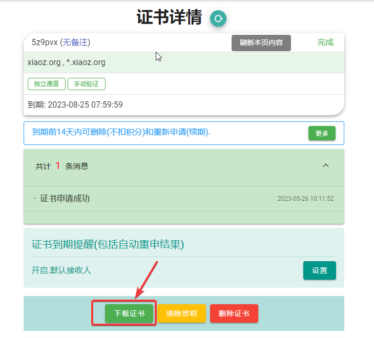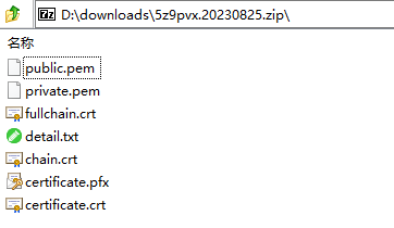 fullchain.crt:完整证书, 可更改后缀为pemprivate.pem:私钥, 可更改后缀为key
