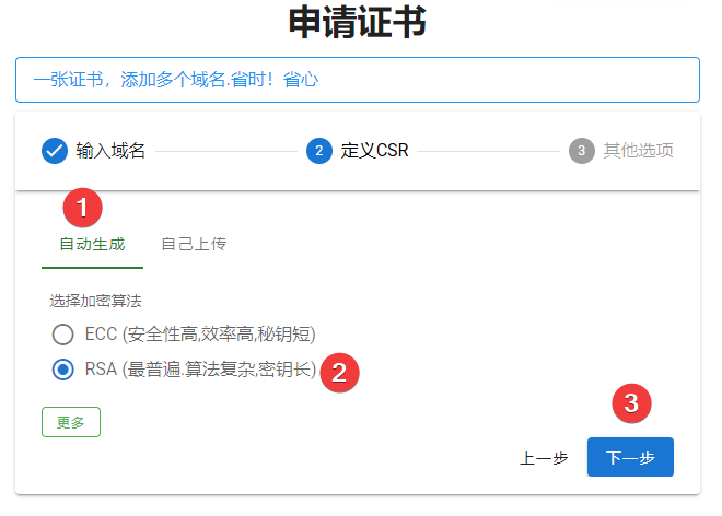 第二步是提交CSR和选择加密算法,CSR一般选择默认自动生成就行了,如果对安全性比较严格,可以自己递交CSR(非运维不推荐)。算法一般选择RSA,兼容性比较好。