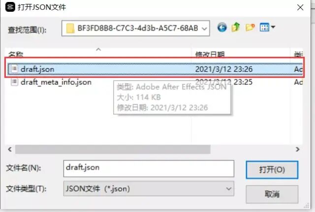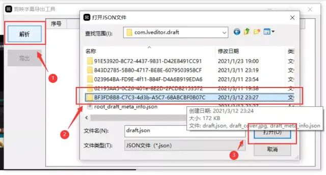 2.之后关闭剪映,打开本资源,点击解析,然后选择最新的文件夹内的Json文件进行打开。