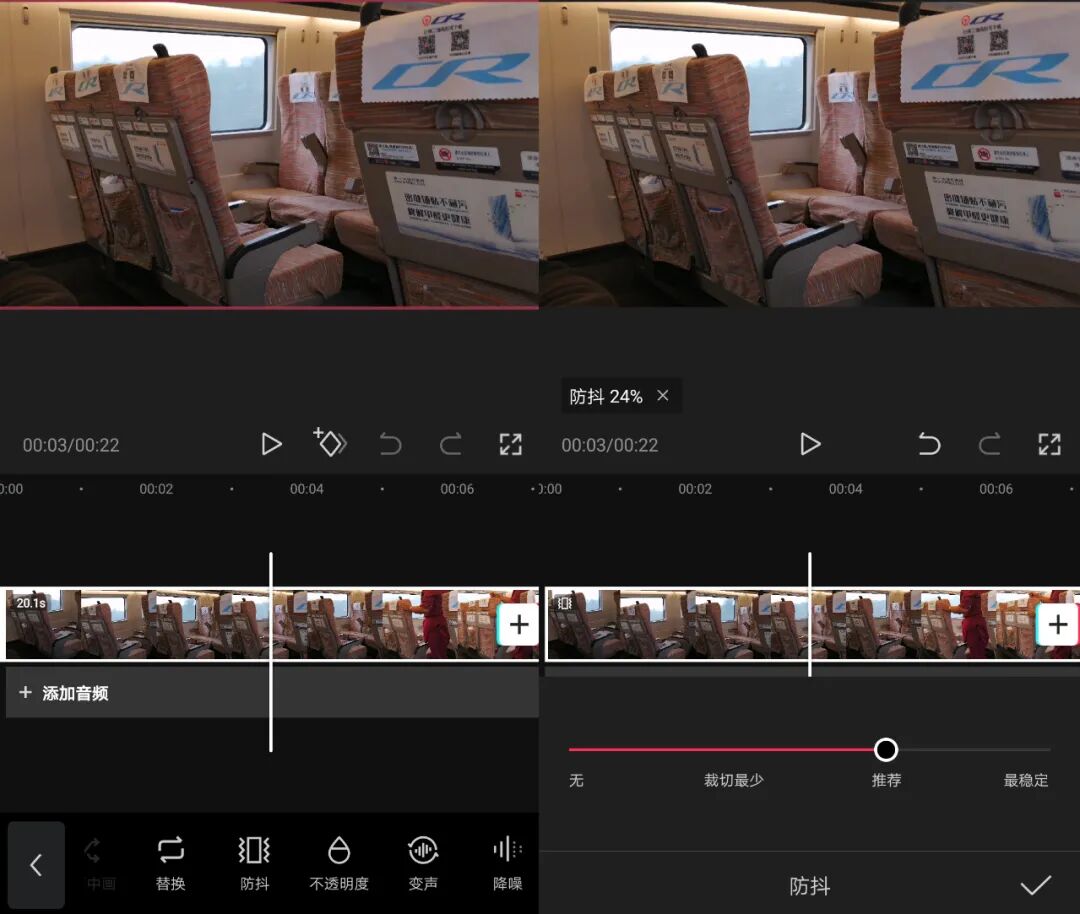 考虑到手持拍摄的不稳定性,剪映支持视频后期的防抖操作;虽然这种防抖功能是以牺牲画幅大小为代价,但一款APP干了Adobe Pr的活儿,此处应该有掌声。
