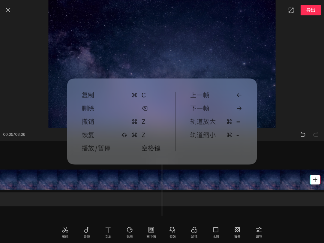 如果你的 iPad 使用了键盘,还可以使用键盘快捷键,进一步提升了剪辑效率。