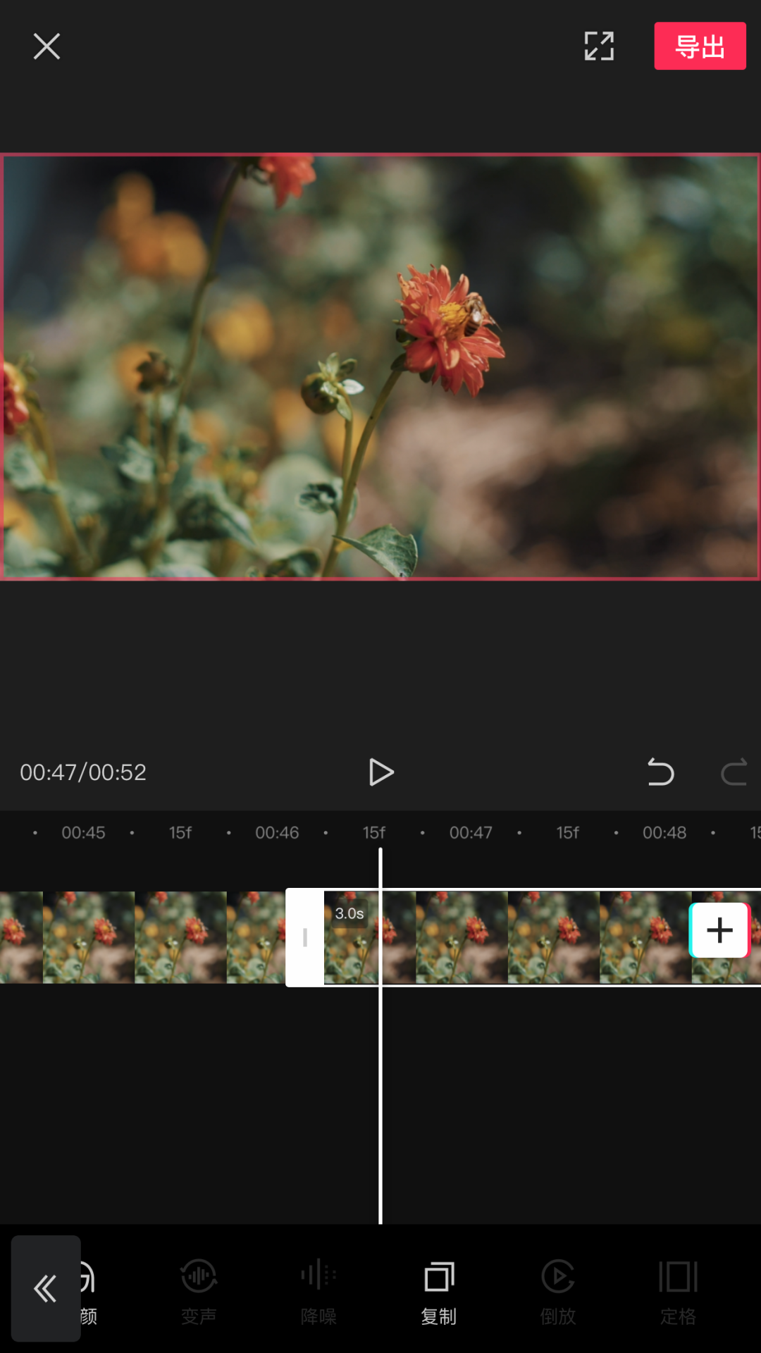 把时间线拖到需要定格的位置,点击定格,视频就会生成定格画面,默认情况下是3秒钟,我们可以拖动两侧修改时长。