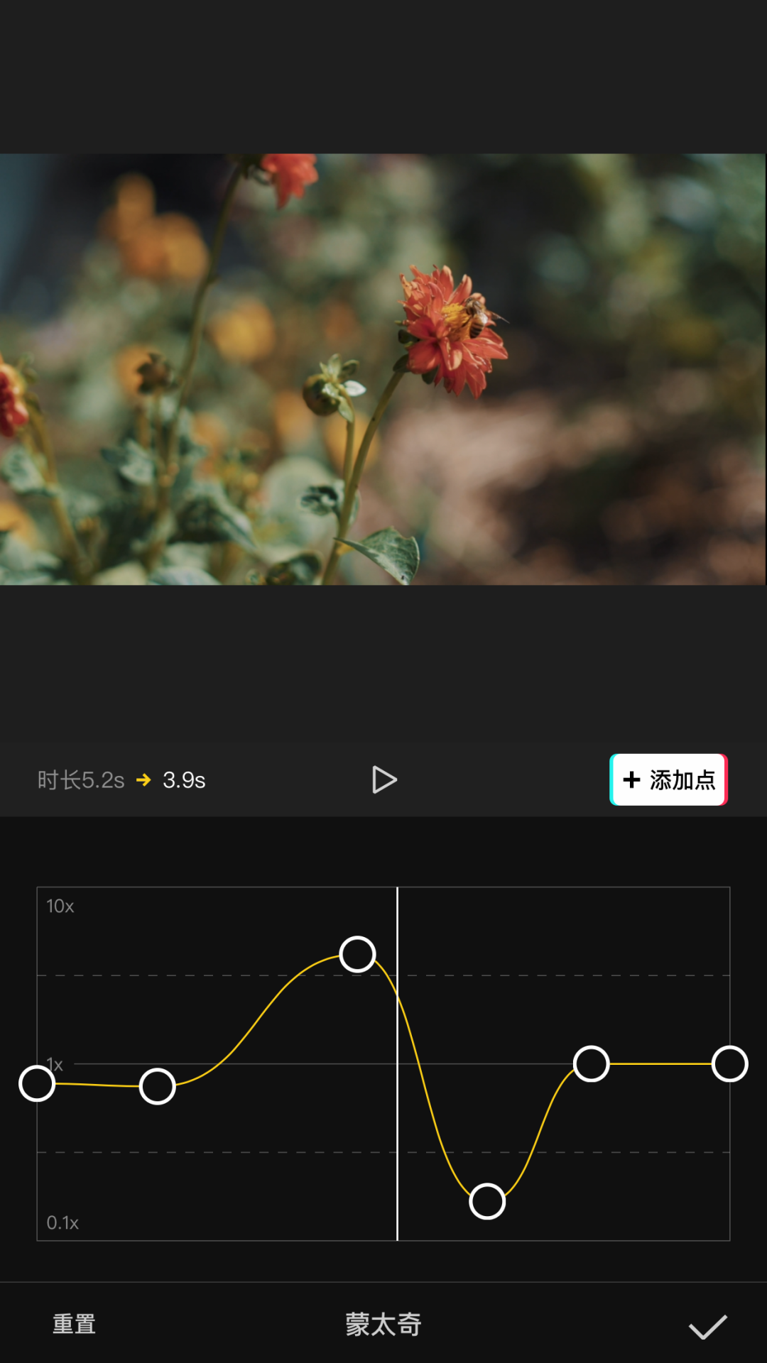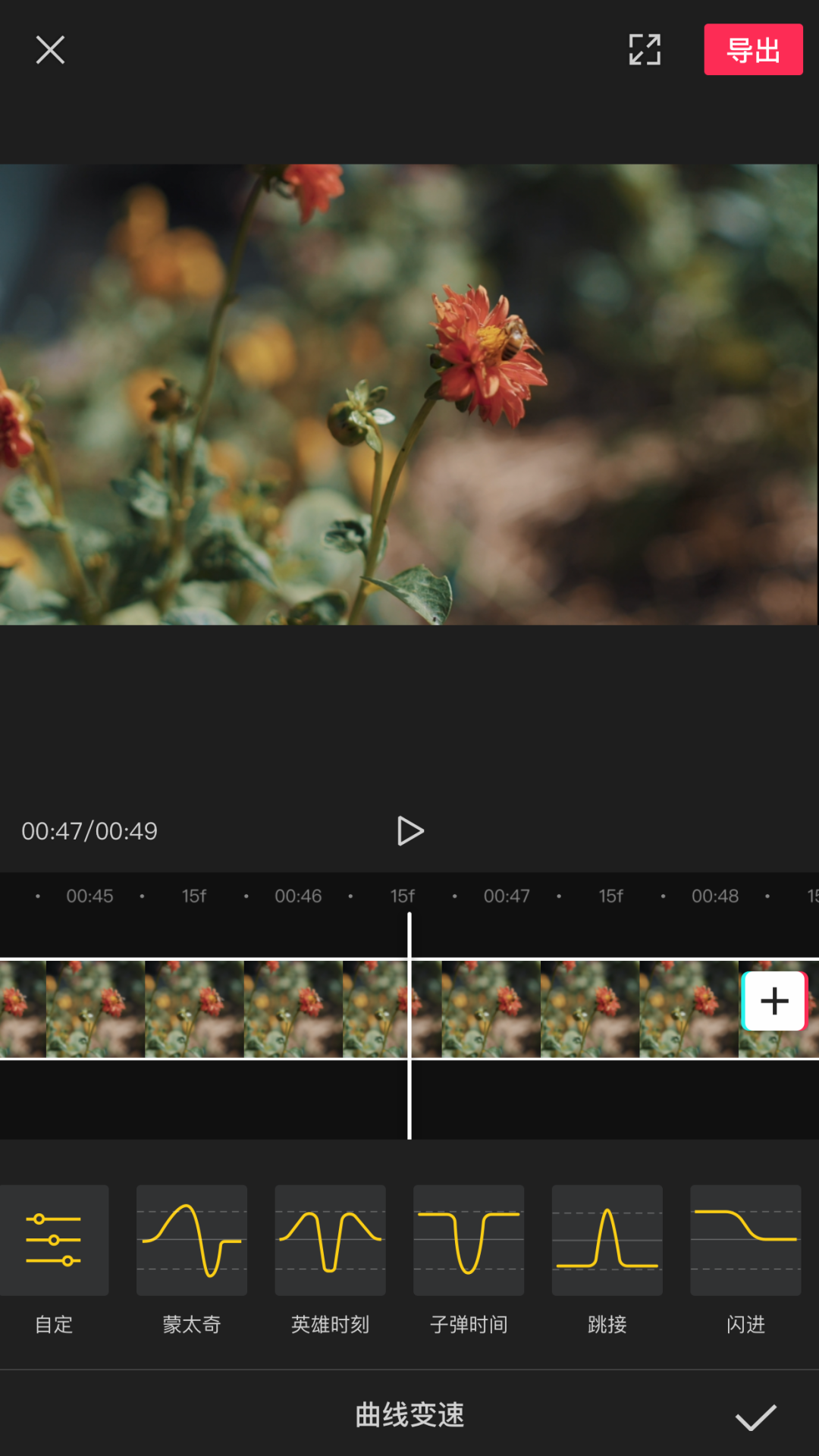 曲线变速则有过渡,能让我们做出很多有创意的效果,点击曲线变速,可以看到几种内置的曲线效果,比如蒙太奇、英雄时刻、子弹时间、跳接、闪进、闪出……这样的变速效果。点击编辑,可以对曲线进行进一步编辑。