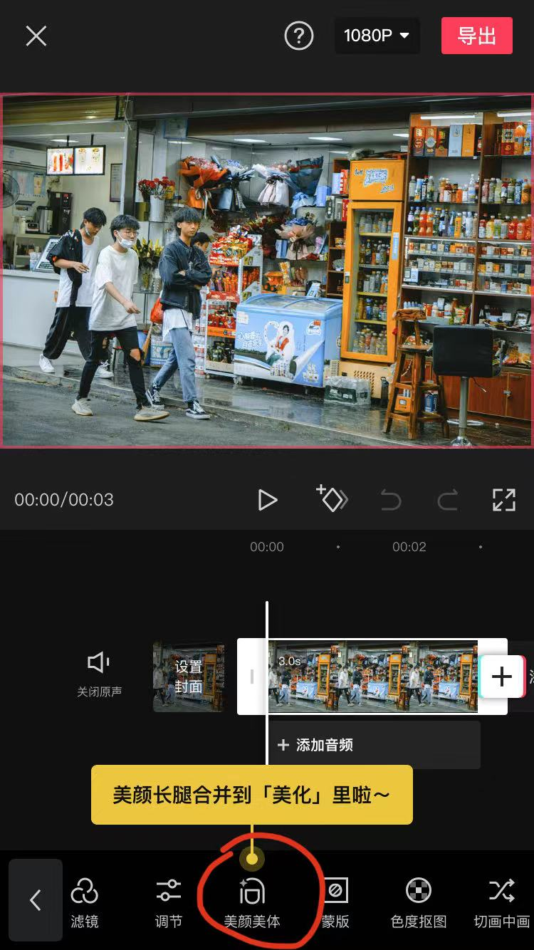 这个功能不用多说,跟美颜相机原理相同,找到美颜美体的功能区,进行美化操作即可,比如美颜、瘦身、长腿等。