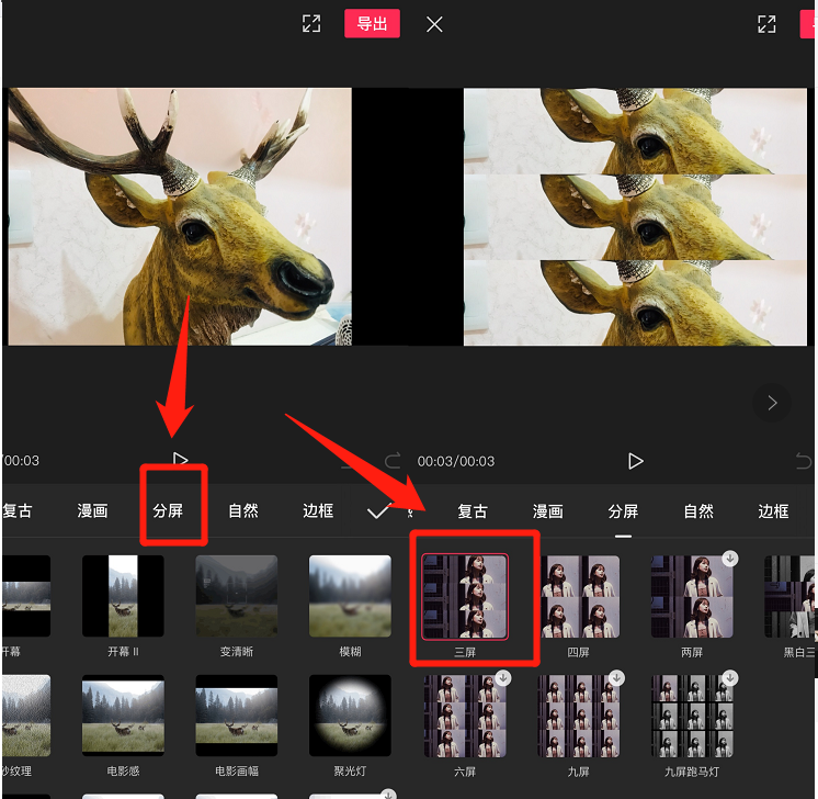 点击剪映菜单栏中的特效,在特效中找到分屏,再出现的界面中选择想要的分屏特效导出来就可以了。