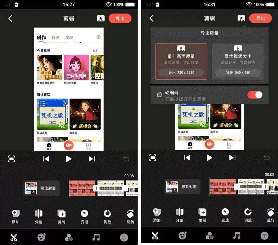 在最后导出视频时,快影有明显的导出按钮,且导出时能够选择画面质量和视频大小。但有一个遗憾是,快影的导出视频会有水印,根据意见反馈,官方显示导出按钮旁的图标可以去除水印,但需要分享到微信后才有7天的权限。这是体验过程中,最让人懊恼的一件事。