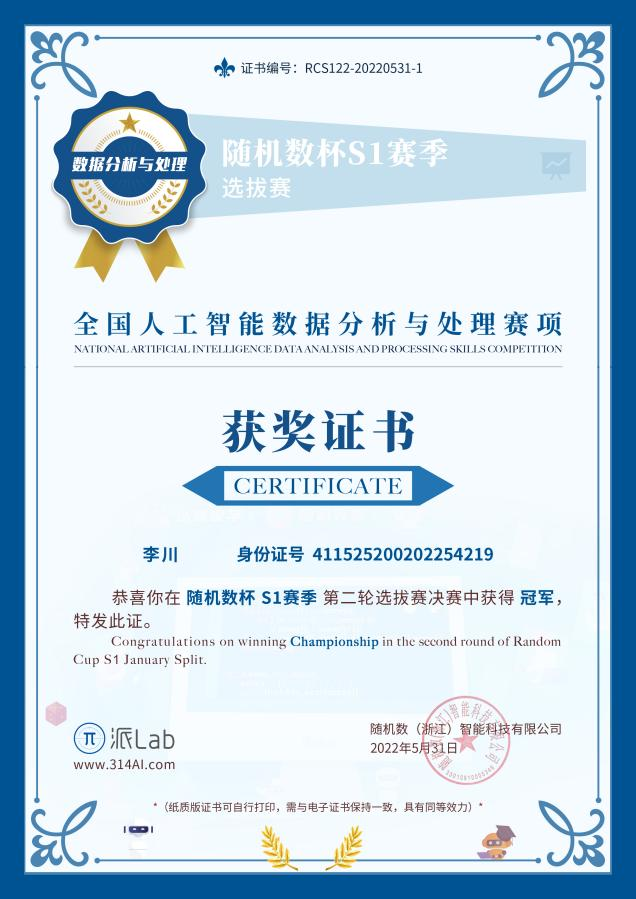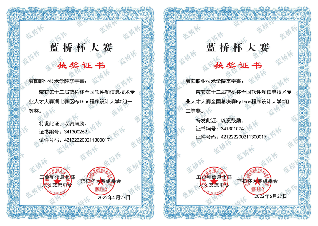 2022年获第十三届蓝桥杯软件设计大赛省级一等奖、国家二等奖