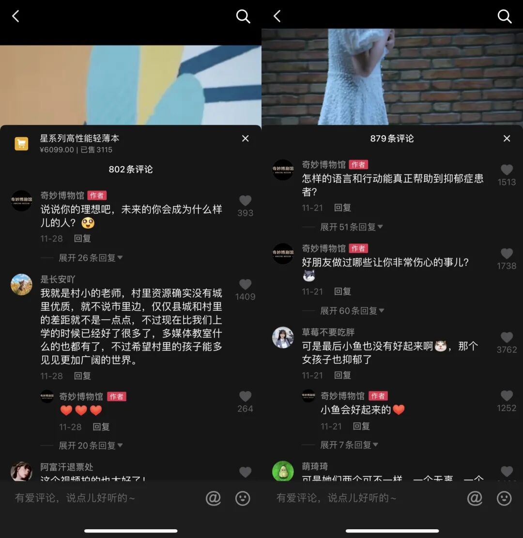 像账号奇妙博物馆每一期都会就视频的主题在评论区提问,引导粉丝留言互动。这些经由粉丝参与的评论和分享,会带动其它围观用户花更长的时间停留在当前页面观看,用户看视频的正向行为也会助力该视频获得更多的流量曝光。