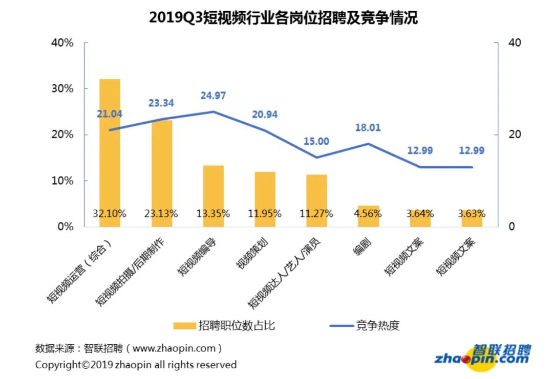 智联招聘在《2019年短视频/直播行业人才发展报告》中提到2019 年三季度,短视频行业招聘职位数同比增长了 325.28%,2019年三季度向短视频领域投递的简历数量同比提高了 371.69%。