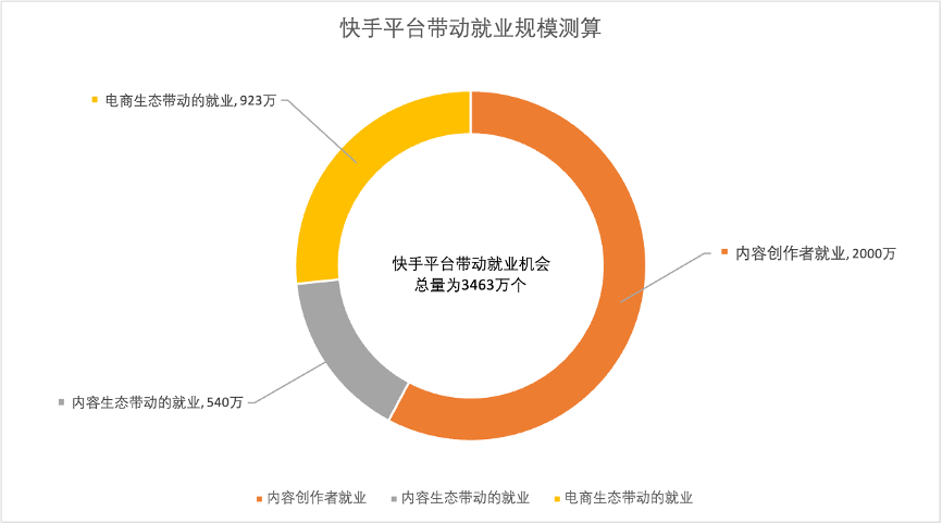在众多数字平台中,短视频和直播平台作为数字经济的一种新载体,已发展为涵盖内容消费、知识传播、电商销售、本地生活等复合功能于一体的综合平台。报告测算结果显示,快手平台共带动就业机会3463万个。其中直接带动的就业机会共2000万个,主要来自内容创作者的就业机会。