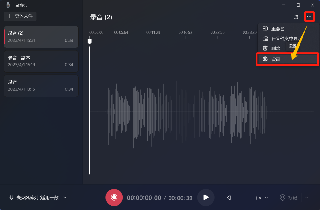 为了保证录制的音频文件的质量,我们还可以对录音机软件进行一些设置。点击右上角…按钮,再点击设置,见下图。