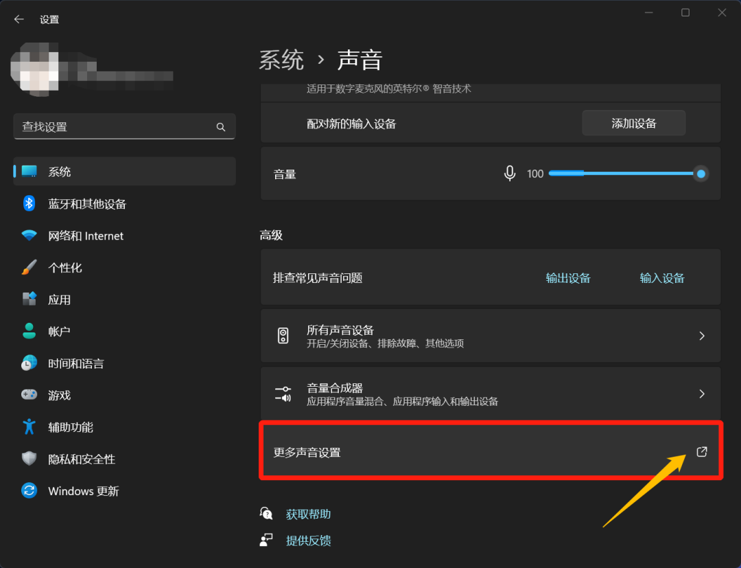 在系统-声音对话框中将界面滚动到底部,点击更多声音设置,见下图。