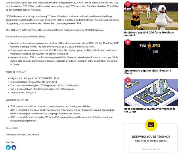 近日,海外媒体域名杂志(DomainMagazine)发布了一篇资讯,介绍了.top溢价域名的销售情况以及市场发展情况。