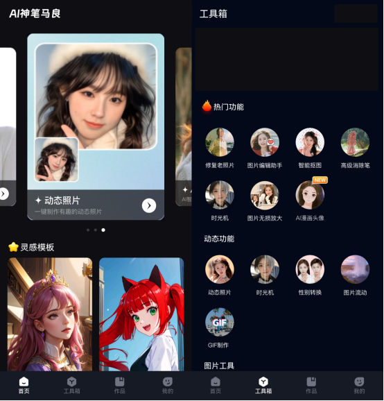 首先带来的是一键AI绘画。它可以立即将你的照片转变为不同风格的艺术作品。只需输入你梦想中画面的相关描述,选择一个艺术风格,点击生成按钮,你的照片就会以匠心独具的方式呈现在你面前。无论是卡通漫画、炫彩插画还是中国风,你都能轻松体验到一个个让人惊叹的视觉盛宴。