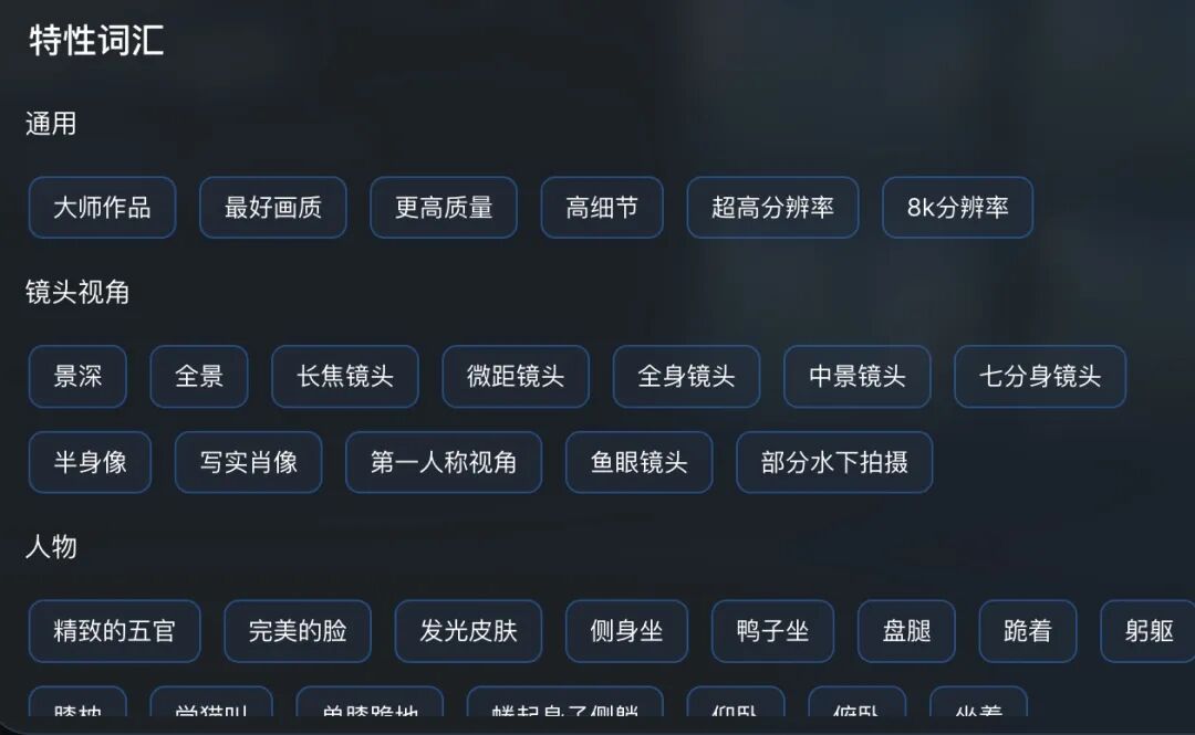 当你开始尝试自己写关键词的时候,即时 AI 灵感还贴心的提供了非常多「特性词」,点击选择对应的就可以控制镜头视角、人物动作、光影效果等等。